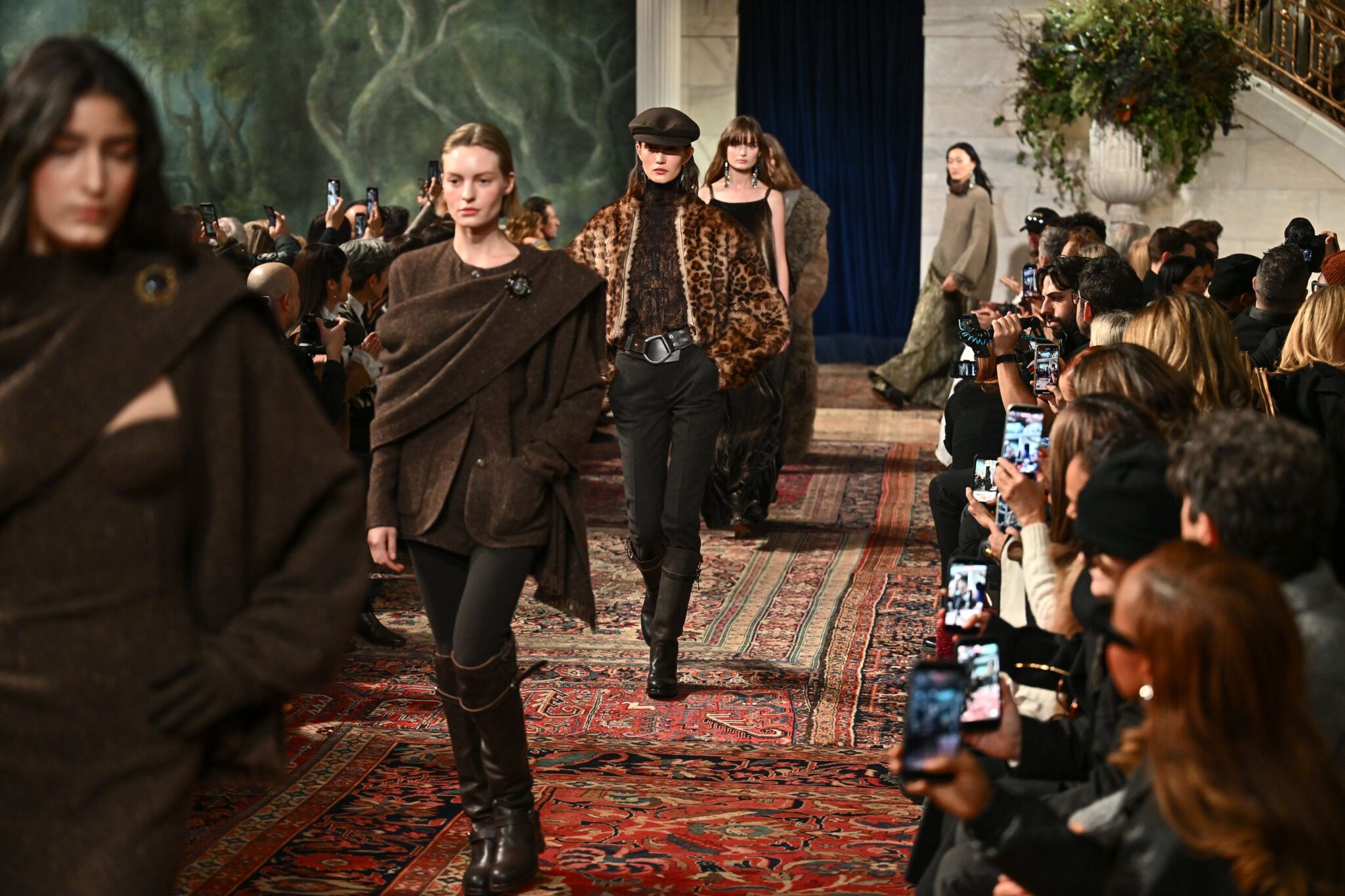 Throughout the show, Ralph Lauren leaned into storytelling. Models strode confidently in oversized shearling coats, belted riding jackets, slouchy leather trousers, and softly ruffled blouses. Eveningwear offered contrast: velvet gowns with dramatic capes, lace inserts, and sculptural shoulders added a sense of theatricality without losing the brand’s signature polish.